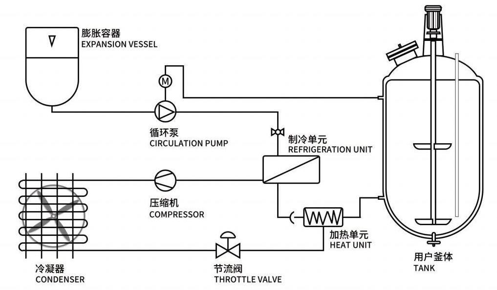 大型高低溫一體機裝置整個系統的液體循環是密閉的,系統帶有膨脹容器,膨脹容器和液體循環系統是絕熱的,不參與液體循環,只是機械的連接,不管循環液體的溫度如何,膨脹容器中的介質始終保持室溫。由于整個液體循環是密閉的系統,所以低溫時沒有水汽的吸收,高溫時沒有油霧的產生。公司可以提供工作溫度很廣的導熱油,...